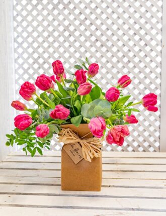 33,00€ IVA incluidoJarrón de cartón con bolsa de agua en su interior para transportar perfectamente un precioso bouquet de 20 tulipanes.NOTA: Los tipos de flores son diferentes cada semana, por eso, no podemos asegurar la variedad de la flor de tu arreglo, pero si respetaremos el diseño y tono, para que tu ramo sea super bonito y con las flores mas frescas. *Este producto solo está disponible para recogida en tienda o reparto en la provincia de Castellón. EL ENVIO NO SE PUEDE REALIZAR POR AGENCIA 24/48h (PENINSULA) YA QUE NO PODEMOS GARANTIZAR QUE LLEGUE EN PERFECTO ESTADO.*