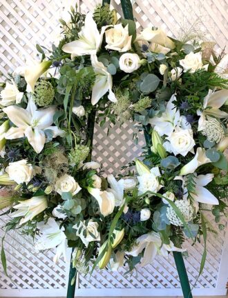 220,00€ IVA incluidoCorona en tonos blancos. Diametro 60cm. La flor puede variar segun disponibilidad. Si quieres personalizar tu arreglo, puedes escribirnos y nos adaptamos a tus gustos.NOTA: Los tipos de flores son diferentes cada semana, por eso, no podemos asegurar la variedad de la flor de tu arreglo, pero si respetaremos el diseño y tono, para que tu ramo sea super bonito y con las flores mas frescas.CORONA FUNERARIA VARIOS COLORES